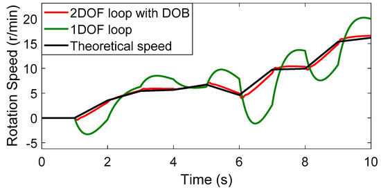 According to the above model, a tracked vehicle with an equivalent inertia of 3180 kg·m2 is simulated. The control model is established in Simulink and the speed response under a random torque signal is simulated, and the results are shown in Figure 12. Because of the large amplitude transformation of random signals, this type of signal also acts as the interference signal affecting the system, and the output speed deviates greatly from the theoretical speed under the control of the traditional 1DOF loop. Furthermore, by applying the 2DOF system with DOB described in this paper, it is found that the speed deviation of the system decreases significantly. Therefore, it can be seen that the control loop has an obvious effect on stabilizing the system and reducing the deviation.