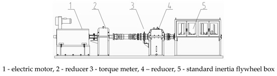 The mechanical structure of the standard inertia (flywheel box) test is shown in Figure 14. According to Formula (44), when the input torque is constant, the speed of the system should rise uniformly in a constant angular acceleration . Therefore, the standard inertia of the system can be calculated by the input torque and the measured velocity curve. In practical experiments, the formula is modified to because of the resistance of the system, which is mainly related to the rotation speed [25,28]. When the rotation speed of the system is at a proper level, the resistance of the system is basically stable. Therefore, the angular acceleration can be measured by changing different driving torques, and the standard inertia of the system can be obtained by two sets of equations.