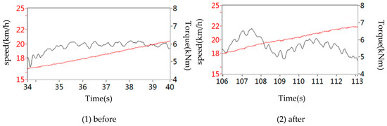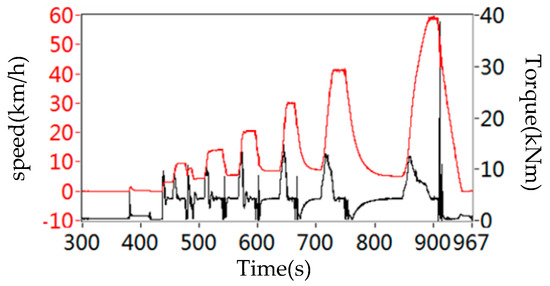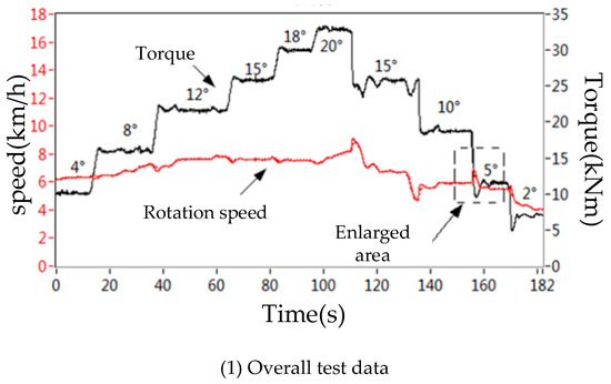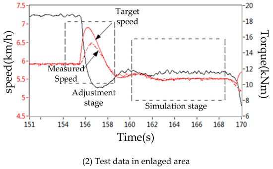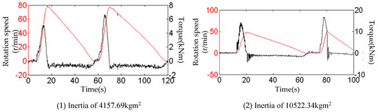 In order to study the accuracy of the electrical inertia simulation, the driving shaft and gearbox were used to connect the two ends of the tested motor to remove the intermediate vehicle, as shown in Figure 13. At this time, the right analog end simulates the inertia load by using the speed tracking method, and the left driving motor imposes a preset load. According to Formula (44), when the system torque is known, instantaneous acceleration of the system can be obtained by deriving the system speed, and the inertia of the instantaneous motor simulation can be obtained. Comparing the measured inertia with the standard inertia, the electric inertia can be calibrated.