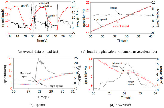 In order to achieve this function, the driving moment of the tested vehicle is measured by the torque sensor, and the theoretical rotational speed of the driving wheel can be obtained by substituting into Formula (6). When the combined torque of and output torque of the load analog motor makes the system rotate, the current rotational speed is obtained by the sensors and a controller C is designed to make infinitely approach , so that the simulation of vehicle driving resistance can be realized. The system control block diagram is shown in Figure 10, where G(s) and J(s) are the transfer function of the motor and transmission mechanism, respectively.
