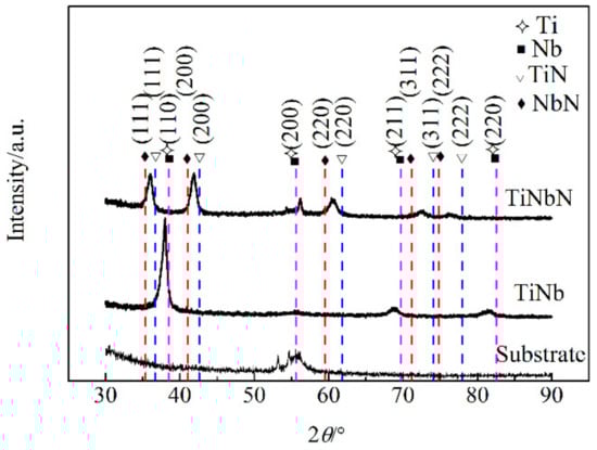 The vertical hatched lines represent peaks recorded in PDF cards No. 38-1155 (cubic NbN), No. 38-1420 (cubic TiN), No. 34-0370 (cubic Nb), and No. 44-1288 (cubic Ti). The diffraction peaks of cubic Nb and Ti are very close and consequently indicated by the same lines. The TiNb film follows the same patterns suggesting that the alloy has the same cubic structure. It is reasonable to assume a solid solution of Ti and Nb. The angles are shifted to lower values indicating some stress. For the TiNbN coating, the Bragg angles of diffraction peaks are between those of TiN and NbN, which denotes that TiN and NbN are likewise a solid solution []. Moreover, diffraction peaks arising from (111), (200), (220), (311), and (222) plane reflections are clearly identified, confirming the face centered cubic (fcc) crystalline structure.