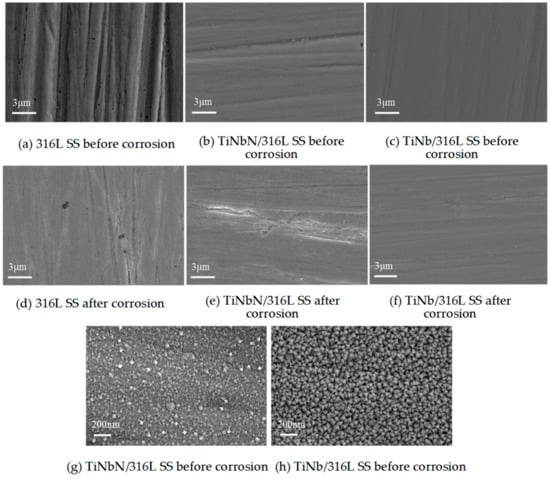 The SEM images of 316L SS, TiNbN/316L SS and TiNb/316L SS before and after potentiostatic polarization corrosion tests are shown in Figure 2.