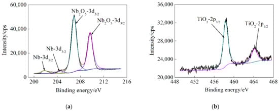 - Bahl, M.K. ESCA studies of some niobium compounds. J. Phys. Chem. Solids 1975, 36, 485–491. [Google Scholar] [CrossRef]