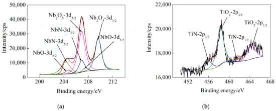 The chemical states of Ti and Nb in the surface layers of the TiNb and TiNbN films were examined by XPS. The original Nb 3d and Ti 2p spectra are shown in Figure 4 and Figure 5. After fitting all the spectra with backgrounds subtracted, Nb 3d and Ti 2p peaks were analyzed according to the NIST XPS Database [], relative literatures and possible reactions in testing environment. In Figure 4a, it’s deduced that the highest doublet peaks are related to 3d5/2 and 3d3/2 of Nb in Nb2O5 and the lower peaks represent metal Nb [,,,]. From the Ti 2p fitted spectra in Figure 4b, two peaks are observed corresponding to Ti 2p3/2 and Ti 2p1/2 in TiO2, respectively [,]. The testing results reveal that the surface layer of the TiNb coating is primarily composed of Nb2O5 and TiO2, which means the TiNb coating can be oxidized spontaneously in air and form a stable metallic oxide film. Figure 5 shows XPS spectra of Nb 3d and Ti 2p of the TiNbN coating. The fitted Nb 3d spectra depicted in Figure 5a indicate that the major peaks representing Nb 3d5/2 and Nb 3d3/2 can be ascribed to the formation of Nb2O5, NbN, and NbO [,,]. The Ti 2p fitted spectra in Figure 5b reveal the existence of TiN []. But the two largest peaks stem from Ti 2p3/2 and Ti 2p1/2 in TiO2 [,]. From the fitted results, it is obvious that under the sputtering conditions mentioned above, TiN and NbN were synthesized. Due to the exposure of the coating to air, stable oxides of Ti and Nb were also formed in the outer layer of TiNbN coating. Since the main surface composition difference between TiNb and TiNbN coatings lies in TiN and NbN, metallic nitrides could play an important role in exhibiting some different properties for TiNb/316L SS and TiNbN/316L SS.
