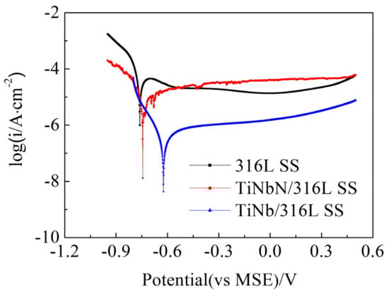 Potentiodynamic polarization curves of 316L SS, TiNb/316L SS, and TiNbN/316L SS.