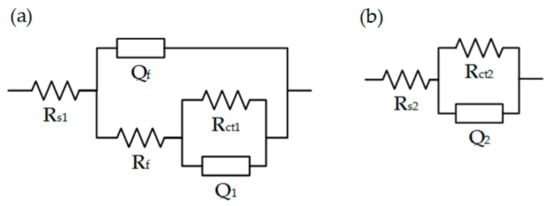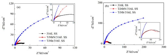 EIS was performed and Figure 7 shows Nyquist impedance spectra of coated and uncoated 316L SS measured at OCP and 0.19 V vs MSE. In Figure 7a, influenced by surface defects, TiNbN/316L SS shows two time constants at OCP which reflect the impedance information from coating and substrate [,]. In the Nyquist impedance spectra of TiNbN/316L SS at 0.19V, TiNb/316L SS, and 316L SS, incomplete semicircular arcs appear. The depressed semicircular shape of SS is attributed to the roughness of sample’s surface. To fit the impedance spectrum of TiNbN/316L SS measured at OCP, an equivalent circuit with two constant phase elements (CPE), shown in Figure 8a [], is adopted. The CPE is represented by Q. Under ideal conditions, a CPE corresponds to a capacitor []. Rs is the resistance of electrolyte solution between working electrode and reference electrode. Rf and Qf are coating’s resistance and capacitance, respectively, and Rct is the charge transfer resistance, while Q1 represents the double layer capacitance []. The other spectra in Figure 7a,b are fitted by the equivalent circuit in Figure 8b []. Table 1 lists the fitted values of Rct. The higher Rct suggests the enhanced corrosion resistance [,].