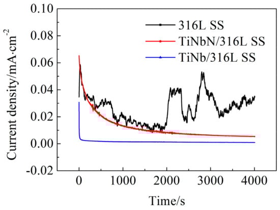 Potentiostatic polarization curves of 316L SS, TiNb/316L SS, and TiNbN/316L SS.