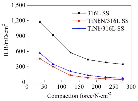 In the low-force region, as compaction force raises, the contact area between carbon paper and sample increases leading to the decrease of ICR, and when the force is high enough, the ICR is dominated by the surface composition and nature [,]. At the same force, the contact resistance of 316L SS, TiNb/316L SS, and TiNbN/316L SS decreases in turn, and their conductivity increases sequentially. I.e., both the TiNb and the TiNbN coatings provide lower ICR than 316L SS’s, but the effect of TiNbN is more remarkable. At 276 N·cm−2, TiNbN coating’s ICR is approximately 48 mΩ·cm2, and the ICR value of TiNb/316L SS is nearly 1/5 of that of 316L SS. One of the reasons behind this is that both coatings could reduce the roughness of 316L SS substrate leading to an increased contact area. For the TiNbN coating, the dopant of TiN and NbN in its surface layer improves conductivity. In comparison with TiO2 and Nb2O5, TiN [] and NbN have higher conductivity. Overall, the TiNbN coating is of relatively high electrical conductivity, and the TiNb film reduces the substrate’s ICR. However, considering the moderate corrosion resistance of TiNbN, TiNb/316L SS is more promising for use as bipolar plate. Further studies are relevant assessing a combined film with good conductivity from TiNbN and great corrosion resistance from TiNb.