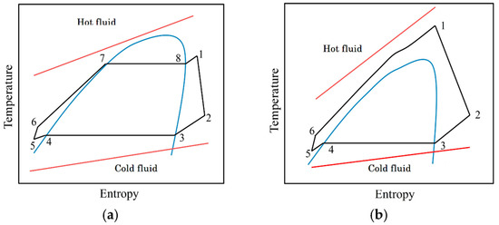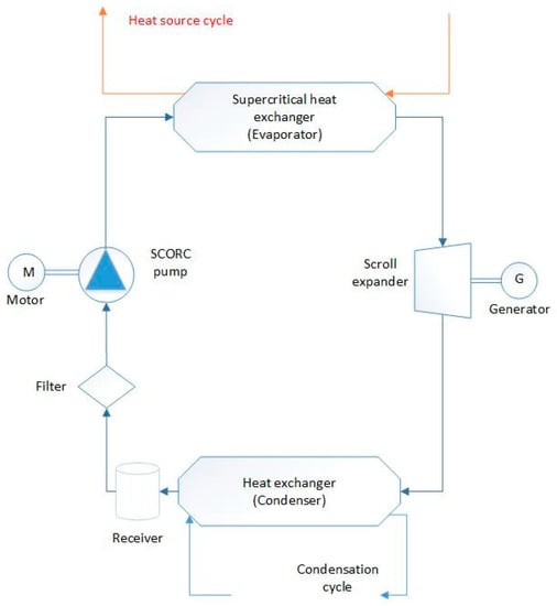 As mentioned in the previous section, the supercritical organic Rankine cycle (ORC) presents the exact same configuration as the supercritical steam Rankine cycle (see Figure 3), however the working fluid is an alternative fluid rather than water. The organic fluids that can be used in temperatures below 400 °C do not need to be highly superheated in most of the cases, a fact that leads to higher cycle efficiency [25]. This allows to exploit low-grade heat sources that otherwise would be wasted. However, unlike large-scale utility steam power plants where the use of supercritical cycles has been accomplished, in small/medium-scale systems using a supercritical ORC, the selection of the appropriate components becomes very challenging. Moreover, low-temperature operation (below 100 °C) brings some additional restrictions, since a limited number of fluids can be used for such purposes and the cycle configuration does not allow any flexibility.