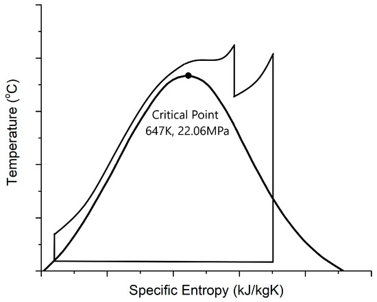There are several methods to improve the thermal efficiency of a Rankine cycle. One way frequently used to increase the cycle’s efficiency is to increase the temperature of the steam entering the turbine. However, this temperature is restricted by metallurgical limitations imposed by the materials and design of the components and primary piping. The equipment and piping must withstand high pressures and great stresses at elevated temperatures. With new material development it is possible to go to higher temperatures during superheat and reheat. To balance that with the wetness at the last turbine stages, higher boiler pressure is required. Most thermal power plants are currently designed to operate on the supercritical Rankine cycle (i.e., with steam pressures exceeding the critical pressure of water 22.1 MPa, and turbine inlet temperatures exceeding 374 °C). Supercritical fossil fuel power plants present efficiencies of around 43%. Moreover, efficiencies of 48% are reached for very complex coal-fired power plants that operate at “ultra-critical” pressures (i.e., around 30 MPa) and use multiple stage reheat (see Figure 2) [21].