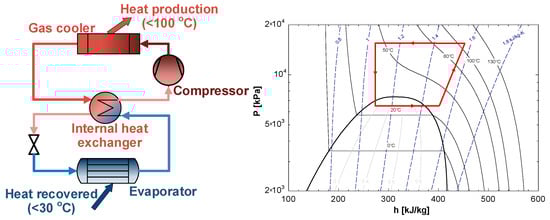 Heat pumps have been proposed for heat recovery applications, upgrading their heat supply to temperatures up to 150 °C or higher [81]. Most of the commercial and experimental units are based on subcritical cycles, with few examples available in the literature operating at transcritical conditions. A typical cycle design of a transcritical heat pump employing an internal heat exchanger for increasing the cycle performance and the corresponding pressure-enthalpy chart are shown in Figure 4. Most of the relevant applications concern a heat pump with CO2 as its working fluid, with few more using alternative ones. These are presented next.