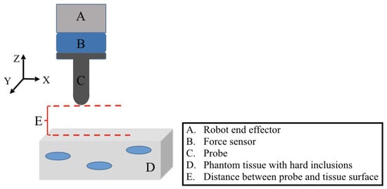 The experiments are performed with the UR5 robot (Universal Robots, Denmark), which is a collaborative robot used for various circumstances. Optoforce (Hungary-based) 6 Axis F/T force sensor () is attached to the end effector of the robot to measure the interaction force. A printer probe with a spherical indentation tip (radius 5 mm, weight 200 g—close to the weight of handled surgical tools) is designed and fixed with the force sensor to perform the palpation task. The soft tissue is made by silicone (Poisson’s ratio ), in which three hard inclusions (stiffer than the phantom tissue and can be considered as a tumor in the experiments) are embedded at different depths under the surface of the tissue (5 mm, 8 mm and 10 mm respectively). The robot and force sensor are running under the Robot Operating System (ROS) with the [40] for low-level control of the robot, and the Cartesian position of the robot is planned using the package. The experiments are conducted to palpate the soft tissue with four different setups: A: No hard inclusion (tumor); B: Hard inclusion (tumor) with 5 mm depth; C: Hard inclusion (tumor) with 8 mm depth; and D: Hard inclusion (tumor) with 10 mm depth (the depths denote the distance between the hard inclusion place and the surface of the soft tissue). The palpation task is performed along the Z axis of the robot, and the surface of the tissue is determined by various contact experiments, thus the indentation depth can be calculated from the Cartesian position of the robot. The whole experiment setup is shown in Figure 5.