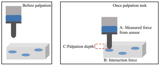 The cancerous nodule in the soft tissue can be palpated by a surgeon during the open surgery, mainly because the tumor is stiffer than the normal surrounding tissue. Researchers in [33] have conducted indentation tests of human and porcine abdominal organs in vivo and ex vivo, and proved that healthy tissues demonstrate similar compliance, but a noticeable difference can be observed for the abnormal tissue surrounded by healthy tissue. When the robot is controlled to palpate the tissue with a force sensor attached to the end, the difference of the force response can be observed when the robot palpates different parts of the tissue at the same indentation depth. It can further be concluded that the one with a large force response is more likely to be tumor. A brief schematic of robotic palpation with a force sensor and probe is illustrated in Figure 1. The force sensor is used to measure the interaction force between the probe and the soft tissue. During the palpation, the probe will be moved to contact the soft tissue, and the real-time force response will be measured by the sensor to describe the applied force during the palpation. When the indentation depths are different, the simple force response is not sufficient enough to explain the location of a tumor, and it is therefore necessary to quantitatively evaluate the mechanical property of the soft tissue for detailed analysis.