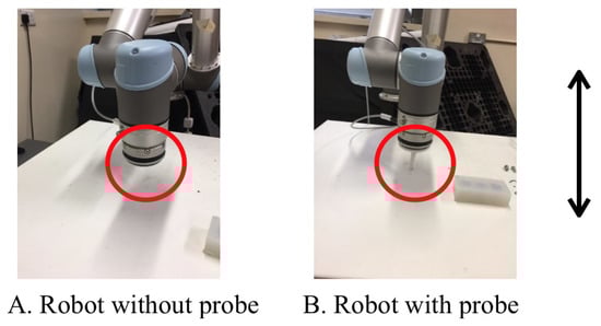 Force uncertainty experiment setup. Experiment A: The probe is not attached on the sensor. Experiment B: A 3D printed probe is attached on the sensor. The experiments are performed by moving the robot in the Z axis with moving up 2 cm and down 2 cm 10 times, which last for around 80 s.