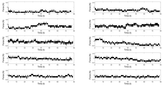 Force data from the force sensor with 10 free motion experiments (with probe attached on the force sensor). During the experiments, the probe does not contact any environment. Each experiment is conducted for around 80 s. Noticeable force is observed and recorded as shown in the figures.
