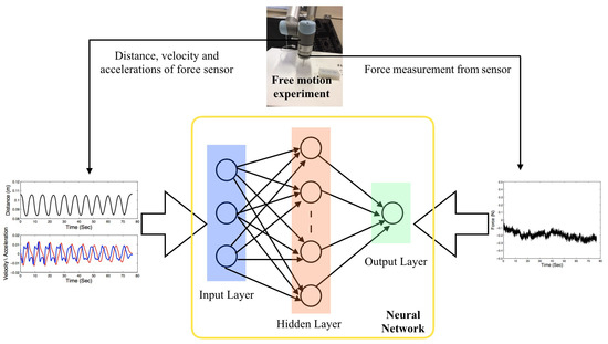 To eliminate the effects of inertial force, unknown disturbance and uncertainty from the output of the force sensor, it is helpful to build the model of the force sensor. In the model, the state information of movement will be utilized as the input of the model while the force output of the force sensor will be used as the output of the model. During the model design process, we seek to observe the relationship between the movements and the outputs of the force sensor, thus the model can be employed to compensate the output of the force sensor. By considering the mapping from the input to the output, it is natural to adopt the supervised learning method [38]. It is worth mentioning that the artificial neural-network-based approaches are reported in [37,39], in which the ANN-based methods are used to successfully classify the materials by the force sensor. In this paper, we propose the neural-network-based approach to model the force sensor in a supervised learning manner.