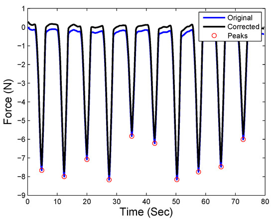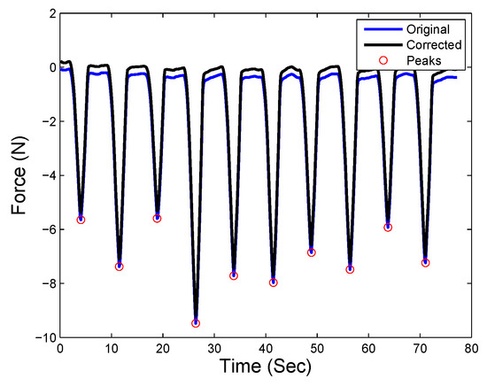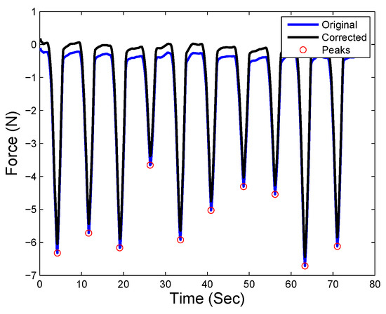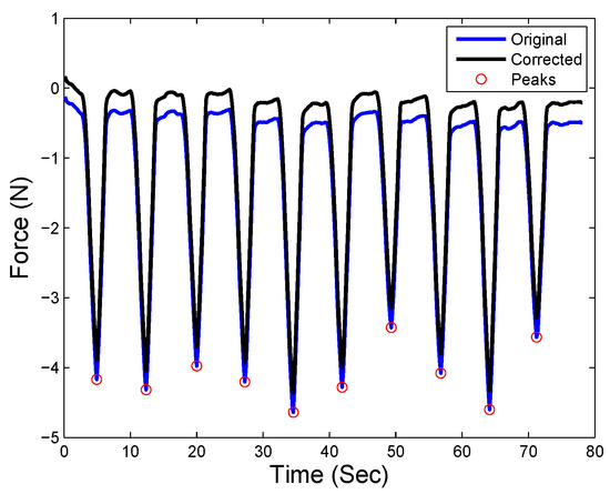 Force correction of the ’no hard inclusion’ case. The blue curve is the original measured force from the sensor, and the black curve shows the corrected force by using the force compensation approach. Peak forces are highlighted with red circles.