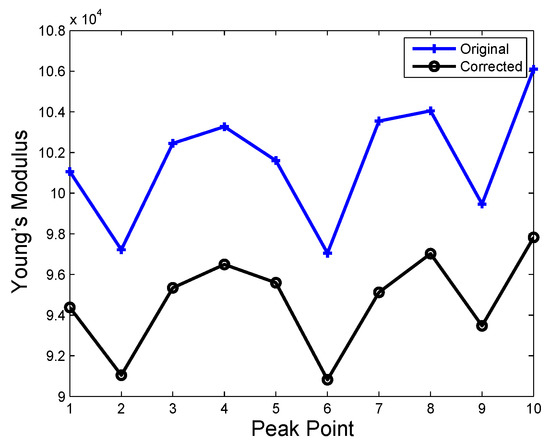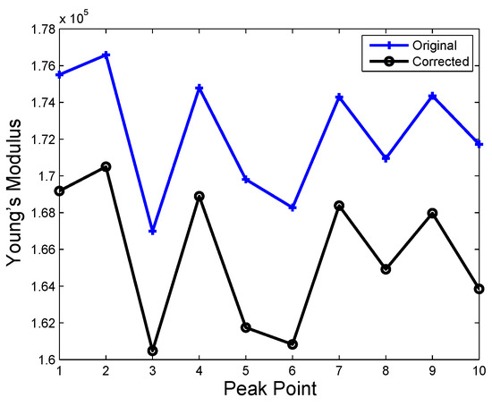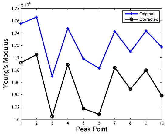 In addition, to further verify the effect of force correction in palpation, the YM analysis at those peak points are conducted since YM is an important aspect to be considered during robotic palpation [22]. For the purpose of comparison, the static experiments have been conducted under the same depth of hard inclusion. The YM from the static experiments is used as the reference value to reflect the stiffness of soft tissue in the palpation. The original and corrected YM at the peak points can be viewed in Figure 16, Figure 17, Figure 18 and Figure 19. The average original, corrected and static YM is also presented in Table 2. From Table 2, it can be found that the YM calculated by the corrected force data is more close to the static experiments, which verifies again the effectiveness of the proposed method.