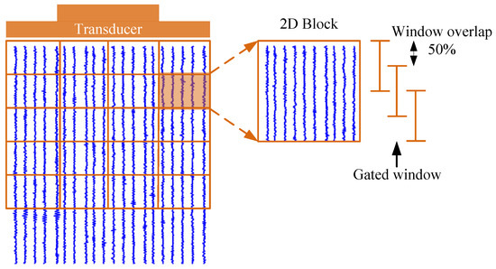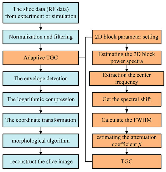 The whole RF dataset was divided into smaller 2D blocks to obtain a consistent power spectrum, and the 2D block diagram is shown in Figure 1. Each 2D block contained ten A-scan lines in the lateral direction, and each 2D block was divided into a gated window with a 50% window overlap in the depth direction. A Hamming window was utilized to minimize spectral leakage artifacts. The size of the 2D block was 2 × 2 mm. The blocks overlapped along the axial and lateral directions with an overlap rate of 50%. Thirty Fourier spectra within the 2D block were averaged to acquire the 2D block power spectrum. The attenuation coefficient β was estimated from ten A-scan lines by averaging the attenuation value of blocks in depth. Then, k was obtained according to Equation (11), and each k applied to the corresponding ten A-scan lines.