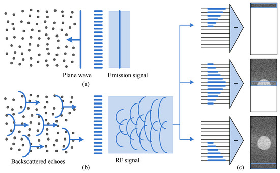 The transmit–receive scheme [21,28]. (a) The single plane wave transmit method. (b) Radio frequency (RF) signals. (c) The beamforming procedure in the receiving mode.