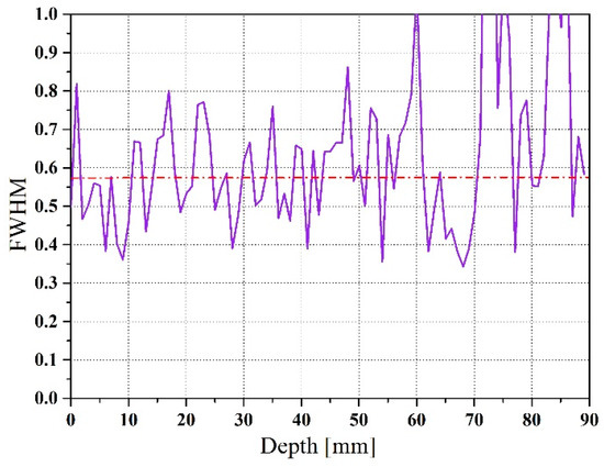 We assumed that the transmit pulse was generally Gaussian-shaped at the center frequency. Hence, the FWHM was calculated using the block power spectrum. The obtained FWHM was changed into a variance to compute the estimated attenuation coefficient because the relationship between the variance of the Gaussian distribution and the FWHM was known. The estimated FWHM is shown in Figure 7.