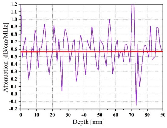 The spectral cross-correlation algorithm was applied to calculate the spectral shift between two consecutive power spectra. The spectral shift was equivalent to the center frequency downshift acquired from two adjacent estimates. The final estimated attenuation coefficient was calculated using Equation (8), as shown in Figure 8. The attenuation coefficient is 0.57, while the theoretical value is 0.6. The standard deviation is 0.23, which is almost 50% of attenuation coefficient.