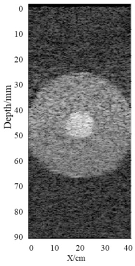 The excitation circuit of the array element was excited simultaneously, and the pulse was transmitted to the target in the form of a wave front. All array elements were transmitted and received together, and then the target was imaged with the received data. Figure 3a indicates that the emission signal is a plane wave. Figure 3b shows the RF signals received by the transducer, and Figure 3c shows that the beamforming procedure is used for imaging. In the experiment, the simulation region of interest was set at 40 mm (width), 10 mm (thickness), and 90 mm (height) to obtain the original RF signal and perform algorithm verification analysis. In the simulation, the scattering was set within a depth of 0–90 mm. We set the scattering density to 5/mm3. The scattering intensity in the background area was set at 1, the circular strong scattering area was set at an imaging depth of 45 mm, and the area radius was 20 mm. The scattering intensity followed the standard normal distribution within the range of [−10,10], and the attenuation coefficient of the imaging area was set to 0.6 dB/(MHz·cm). The attenuation mass phantom was established as shown in Figure 4, which shows that the echo signal decreased gradually with the increase in depth because of the attenuation and strong scattering effect. Therefore, it was necessary to compensate for the attenuation of the echo signal.