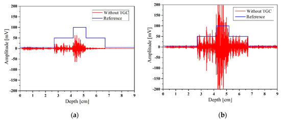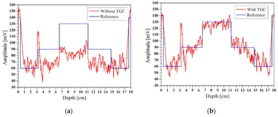 To further illustrate the effectiveness of the improved algorithm, we plotted the cross-section of the horizontal ultrasound tomography image at y = 9 cm, as shown in Figure 14. The y = 9 cm position is represented by a dotted line in Figure 13. Since the breast model was customized, the diameter and location of the mass in the breast model were approximately known, and the reference value was calculated. The signal that was compensated using TGC was segmented, with the segmentation criterion being the mutation position of the signal. The average amplitude of each signal segment was taken as the reference value, as shown in Figure 14. The profiles of the image without TGC and the reference value are shown in Figure 14a, and the profiles with TGC and reference value are shown in Figure 14b. The peak signal to noise ratio (PSNR) and root-mean-square error (RMSE) run for the profiles are shown in Table 1. Comparative analysis showed that the profile with adaptive TGC was closer to the reference value. This clearly illustrated that the algorithm with adaptive TGC could better capture the internal mass and thus better reconstruct the image.