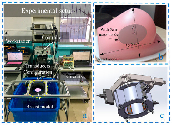 The experimental platform was set up as shown in Figure 11a. It consisted of a workstation, the breast model (Figure 11b), transducer configuration (Figure 11c), ultrasound transmitting/receiving circuits, water tank, and a rotary table controller [22]. A key component of this system was the transducer configuration, which consisted of four vertical ultrasonic transducers in a cross shape surrounding the breast model to achieve non-invasive detection. By controlling the electric rotary table controller through a PC workstation, the electric rotary table induces the PMUT to perform cylindrical scanning. A 64-channel ultrasonic transmitting/receiving acquisition circuit with a sampling frequency of 40 MHz was employed to control the linear array. The breast volume data were obtained by performing cylindrical scanning with a constant interval. Besides, the rotation interval angle is adjustable. A 1 × 128 PMUT linear array was utilized, with a center frequency of 3.5 MHz, consistency of ±1 dB at 3.5 MHz, and a bandwidth of 86.7%. The breast model was customized (Shenzhen Well Come Technology co. LTD, China), and its overall dimensions were 15.5 × 13.5 × 8 cm. The breast phantom was made from a proprietary gel with a physical consistency similar to that of human tissue. The gel was surrounded by an elastic skin-like membrane and is suitable for ultrasound imaging research. The size of the embedded mass in the center was 5 cm, made of urethane rubber and colored for easy visualization. The attenuation coefficient was 0.6 dB/(MHz·cm), and the speed of sound used was 1520 m/s. The operating working range was from 2 to 4 MHz. The experiments were carried out in the water tank with a constant temperature of 32 °C.