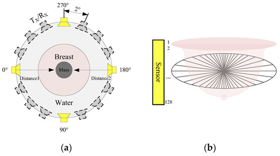 Breast cancer has become a common cancer that affects females worldwide, which is a significant public health issue, with incidence and mortality rates increasing rapidly since the 1980s [1]. The incidence and modality of breast cancer is 24.2% and 15%, respectively, according to the estimated age-standardized mortality rates (World) in 2018. Furthermore, breast cancer has been the top cancer among females in all ages [2]. However, breast cancer survival has improved since the mid-1970s. The decline in cancer mortality over the past two decades is primarily the result of advances in early detection and treatment, which is reflected in considerable decreases for the breast cancer [3]. Specifically, the death rate dropped 39% from 1989 to 2015 for female breast cancer. Therefore, to reduce the mortality and incidence rate, early screening for breast cancer is critical [4,5]. Ultrasonography is an essential method for medical imaging. Compared with other imaging techniques, ultrasound is inexpensive, harmless, and enables easy real-time imaging for medical diagnosis [6]. Ultrasound computer tomography (USCT) is an emerging imaging method and a good prospect in the detection of breast cancer [7]. This approach has several advantages for breast cancer screening compared with classical ultrasonography [8]. Ultrasound tomography not only overcomes the reliance on the operator’s experience but also has potential clinical benefits, such as comfort, safety, and 3D imaging [9]. The transducer is the key component of the USCT system. With the development of the micro-electro-mechanical system (MEMS), the piezoelectric micromachined ultrasonic transducer (PMUT) has become a potential alternative to classical piezoelectric transducers. The potential benefits of the PMUT are its miniaturized size, excellent consistency, and good performance [10].