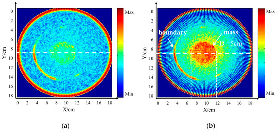 The breast horizontal ultrasound tomography images without TGC and with adaptive TGC were realized as shown in Figure 13, respectively. In the center of the breast model was a mass of approximately 5 cm. The incomplete contour was detected, and the experimental results were consistent with theoretical values. On the other hand, the border of the phantom was not complete. The main reason was the asymmetric shape of the breast model. The tilted side (right side) was not easily detected because the incident angle was relatively large. When dynamic focusing technology is used, the whole border of the phantom will be clearly visible. A slice without TGC compensation is shown in Figure 13a, and a slice with adaptive TGC is shown in Figure 13b. By contrast analysis, the improved algorithm with adaptive TGC detected the internal mass clearly; thus, the compensation for ultrasound attenuation was effective.
