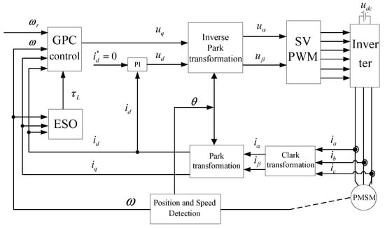 The control system diagram of PMSM is shown in Figure 1. The overall control system includes predictive speed controller, extended-state observer for the disturbance, PI controller for the axis current control, inverter, space vector pulse width modulation (SVPWM) and PMSM. As seen from Figure 1, control is used in this paper, and the PI controller is adapted in axis current loop and the predictive controller is adapted for the speed control. The whole speed-control algorithm is proposed to realize accurate speed tracking and strong robustness for the disturbances.