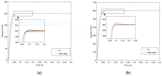 Simulation curves of speed response. (a) n = 200 r/min; (b) n = 600 r/min.