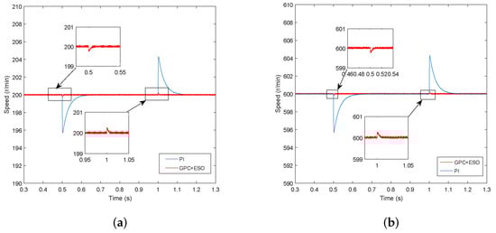 Simulation curves of speed response under the load disturbance. (a) n = 200 r/min; (b) n = 600 r/min.