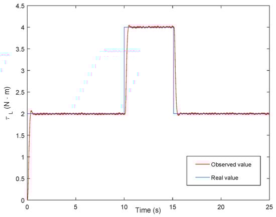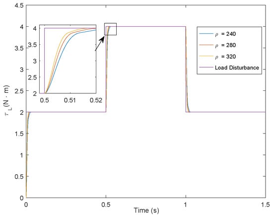 The estimated load torque of the ESO is shown in Figure 4. Given different values of parameter , the tracking speed of load disturbance are also different. In addition, the parameter value should be selected in a certain range for the reason that an excessively big parameter value can also cause overshoot while improving the tracking performance of the ESO.