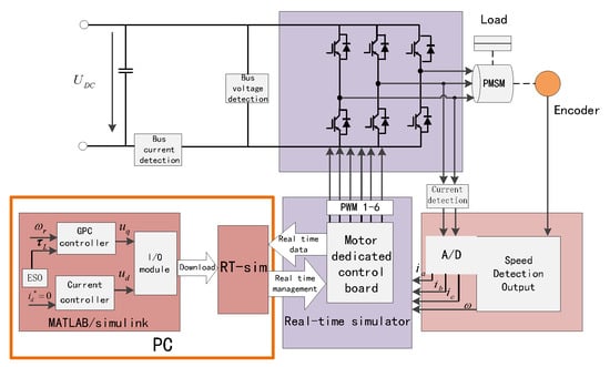 The overall experiments are completed with the LINKS-RT rapid prototyping platform. The system used in this paper is a 130MB150A non-salient pole PMSM and the parameters are shown in Table 1. The inverter switching is 10 KHz. Figure 5 shows the hardware and experimental configuration of the PMSM drive and control system. The platform of the experiment is given in Figure 6.