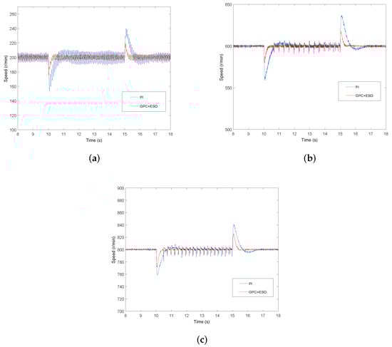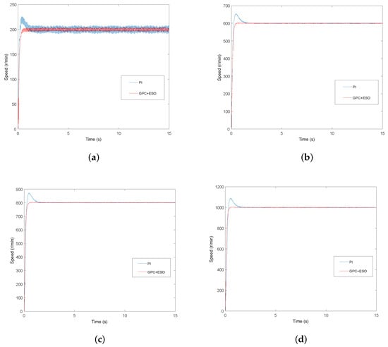 Experimental speed curves under the GPC+ESO and PI method. (a) n = 200 r/min; (b) n = 600 r/min; (c) n = 800 r/min; and (d) n = 1000 r/min.