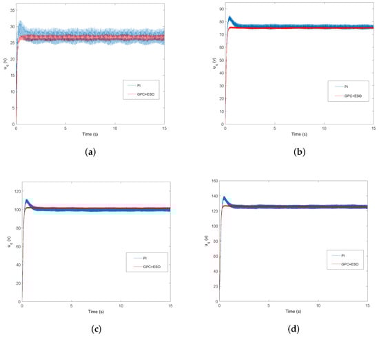 In the closed-loop speed regulation experiment of PMSM, the speed response curves at different given reference speed are shown in Figure 7. Figure 7a shows that under the speed command r/min, the overshoot of the PI method is about 12.5%(25r), the settling time to the steady state is about 1s. In the same condition, the speed response based on GPC+ESO method has no overshoot and the settling time taken to steady state is approximately 0.5 s. Figure 7b–d also show that compared with PI controller, the GPC+ESO method shows a smaller overshoot and shorter settling time. Figure 8 shows the experimental curves of under GPC+ESO and PI method. The results reflect that GPC+ESO speed controller does not need higher voltage to achieve the reference speed. In addition, the voltage has a smaller fluctuation in the GPC+ESO method. From above figures, it can be concluded that the GPC+ESO method can enhance the dynamic performance of the PMSM drive systems.