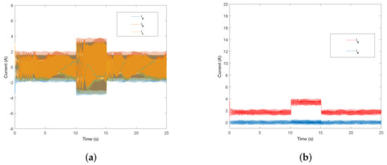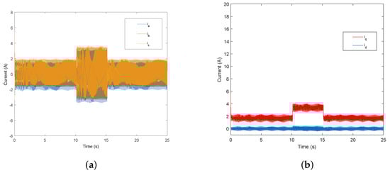 Figure 10 and Figure 11 show the response curves of the current with load disturbance under r/min. The three-phase current response curves of GPC+ESO and PI method are shown in Figure 10a and Figure 11a, respectively. The d-q axis current curves of GPC+ESO and PI method are shown in Figure 10b and Figure 11b, respectively.