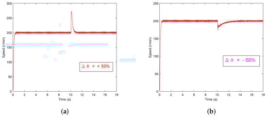 Speed response curves under GPC+ESO method with a sudden change of rotor flux value. (a) ΔΦ = +50%; (b) ΔΦ = −50%.