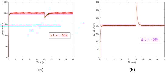 Speed response curves under GPC+ESO method with a sudden change of inductance value. (a) ΔL = +50%; (b) ΔL = −50%.