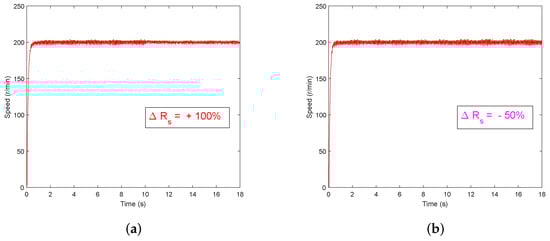Speed response curves under GPC+ESO method with a sudden change of stator resistance value. (a) ΔRs = +100%; (b) ΔRs = −50%.