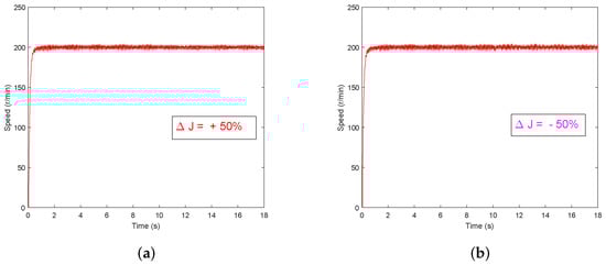 Speed response curves under GPC+ESO method with a sudden change of moment of inertia value. (a) ΔJ = +50%; (b) ΔJ = −50%.