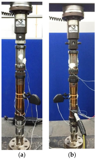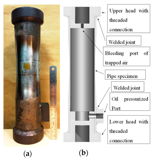 Steel caps were designed and fabricated to fit onto the ends of the pipe specimens. The end caps were screwed and then welded, using gas tungsten arc welding (GTAW), onto the ends of the pipe specimens in order to eliminate axial free play from the thread fastening system. The other sides of the end caps have thread connections designed to fit to the actuator of the universal testing machine. A nut tightening system was used to eliminate thread clearance, which might otherwise cause impact loading to the specimen when alternating between tension and compression loadings. For the biaxial test samples, a socket was welded onto an end cap for the supply of pressurizing oil. The quality of welding was assured by performing Dye Penetrant Inspection (DPI) test on test specimens. Finally, the specimens were heat treated, which involved heating at 900 °C for 1 h in a furnace and allowed to cool in air. The heat treatment reduces the effect of mechanical work from the manufacturing and machining processes and relaxes residual stresses due to welding of the caps. Figure 2 and Figure 3 show the geometry of the specimens.