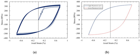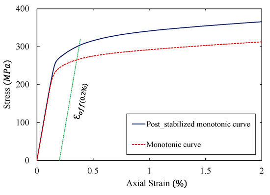 Figure 8 depicts the stress-strain responses from the monotonic and post-stabilized monotonic test superimposed on the upper hysteresis curve result from cyclic test with symmetric strain control in the plastic region. The figure shows the effect of material hardening on the stabilization of stress-strain behaviour after several loading cycles. It can be observed that strain hardening causes a significant increase of the linear section of the post-stabilized monotonic test and the hardening is caused by cyclically stabilized axial strain symmetric cycling, rather than first half tension of strain control monotonic test. In the figure, the transient Bauschinger effect can be observed, which gives rise to a smaller plastic modulus in the stabilized hysteresis loop compared to the post-stabilized monotonic loading. This happens if the applied peak strain is relatively small in prior strain control hardening [36,37,38,39]. The “shifted curve” in Figure 8 refers to the stress and strain data obtained in the upper or lower stabilized hysteresis loading. The shifted curve () obtained from upper curve is regularized by the following equations: