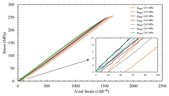The post-stabilized monotonic tension tests were continued up to 1.8% strain. In uniaxial testing, there are two concepts of conducting tests under stress control. The first concept of uniaxial testing is performing incremental loading and unloading to zero load in order to establish an elastic limit, by reading the total strain, which is recorded at every unloaded zero load. In this test, the stress increment for every subsequent loading is set at 4 MPa. The second concept of uniaxial testing is to establish the uniaxial ratcheting rate. Here, the applied stress range is set to 255 MPa under a constant mean stress of 65 MPa.