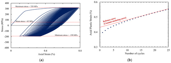 - Taleb, L. About the cyclic accumulation of the inelastic strain observed in metals subjected to cyclic stress control. Int. J. Plast. 2013, 43, 1–19. [Google Scholar] [CrossRef]