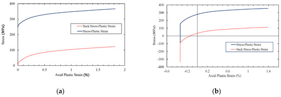 In the positive half cycle of the hysteresis curve, is called the starting point, where plastic strain is zero and is the plastic strain from stress-plastic strain experiment data. The plastic strain range for the segments is determined through extensive trial-and-error runs of the modified Chaboche model program [22,25].