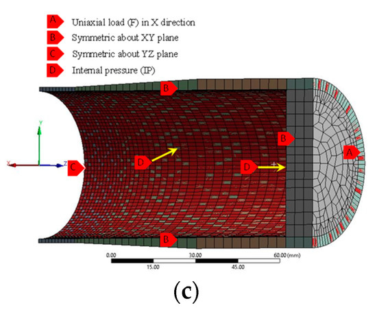 Finite element model of uniaxial specimen: (a) Inside surface symmetric about X-Y plane, (b) through thickness symmetric about Y-Z plane, (c) boundary condition.