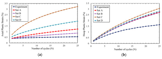 Figure 19 shows the Chaboche model simulation results for the uniaxial and biaxial loadings, using ratcheting parameters presented in Table 4. The value of had been calibrated using uniaxial loading simulation. For different ratcheting parameter sets, the results are evaluated in terms of two main concepts. The first evaluation concept involves simulation results obtained from Sets A and B. The second concept involves simulation results obtained from Sets C and D.